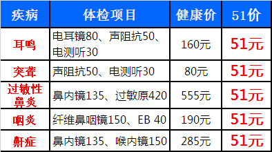 为此,西安中大耳鼻喉医院将于2014年5月1日推出“5月白领健康关爱季”耳鼻喉职业体检活动,具体体检项目如下: