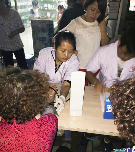 义诊紧张而有序的开始了,中大医护人员仔细为幸福小区居民测血压、做耳鼻喉健康检查,耐心回答每一位居民提出的疑难问题。提供义务咨询、测量血压、咨询、就诊等服务,并针对耳鼻喉常见病、多发病等疾病的健康知识进行详细讲解。及时发现幸福小区居民的潜在病情,为幸福小区社区居民提供最便捷的就医指南,太阳早早的都落山了,整个义诊活动仍在持续进行着。