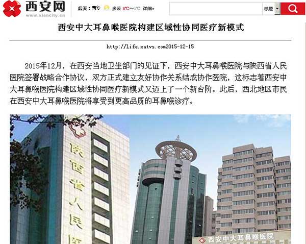 2015年12月,在西安当地卫生部门的见证下,西安中大耳鼻喉医院与陕西省医院签署战略合作协议,双方正式建立友好协作关系结成协作医院,这标志着西安中大耳鼻喉医院构建区域性协同医疗新模式又迈上了一个新台阶。此后,西北地区市民在西安中大耳鼻喉医院将享受到更高品质的耳鼻喉诊疗。