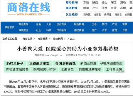 首 页 > 媒体报道 > 【商洛在线】小善聚大爱 医院爱心捐助为小亚东筹集希望